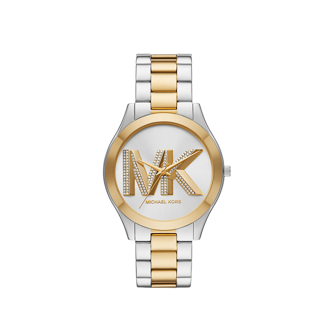 - Esfera: Incluye el icónico logotipo de Michael Kors adornado con detalles de pavé (cristales) sobre un fondo de rayos de sol.