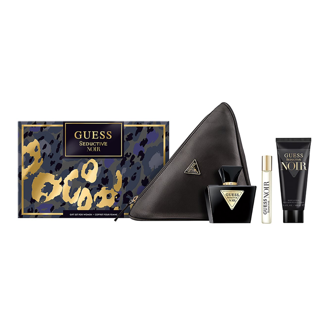 Este producto es el set de regalo Guess Seductive Noir para mujer, que incluye un perfume Eau de Toilette, un spray de viaje, loción corporal y un neceser.